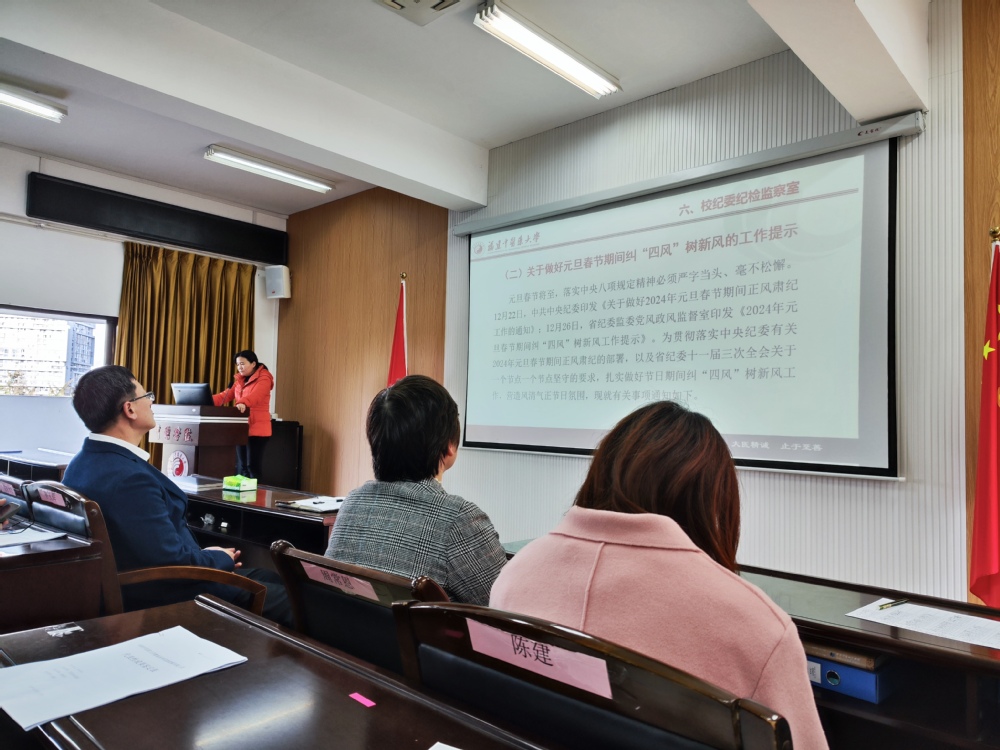 会上,学院党政领导通报了上级纪委披露的近期几起省内公职人员违规案例,强调元旦、春节假期临近,全体教职工要重视假日期间的“四风”问题,以案为鉴,做到清廉过节。
